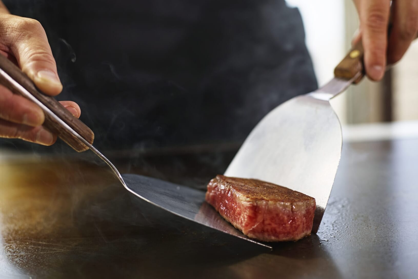 シェフが目の前で焼き上げる臨場感あふれる手さばきとともに、